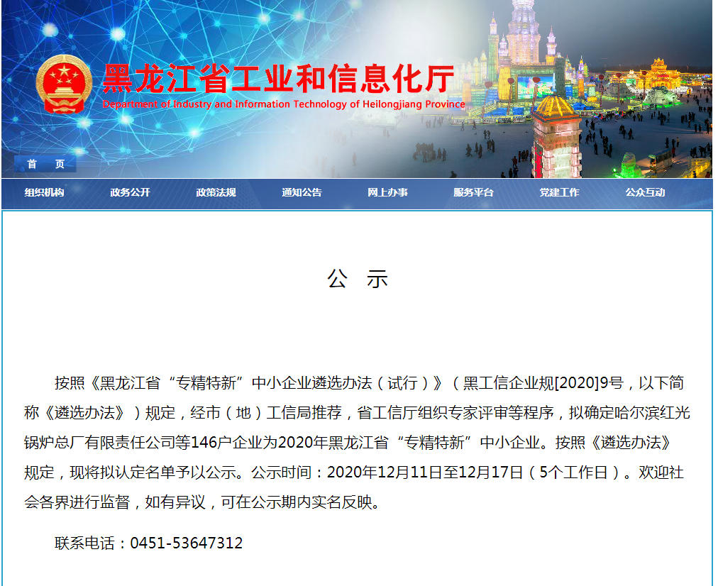 荣获2020年黑龙江省“专精特新”中小企业称号