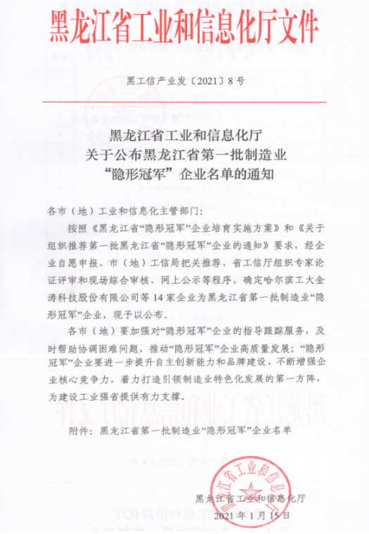 荣获黑龙江省第一批制造业“隐形冠军”企业称号