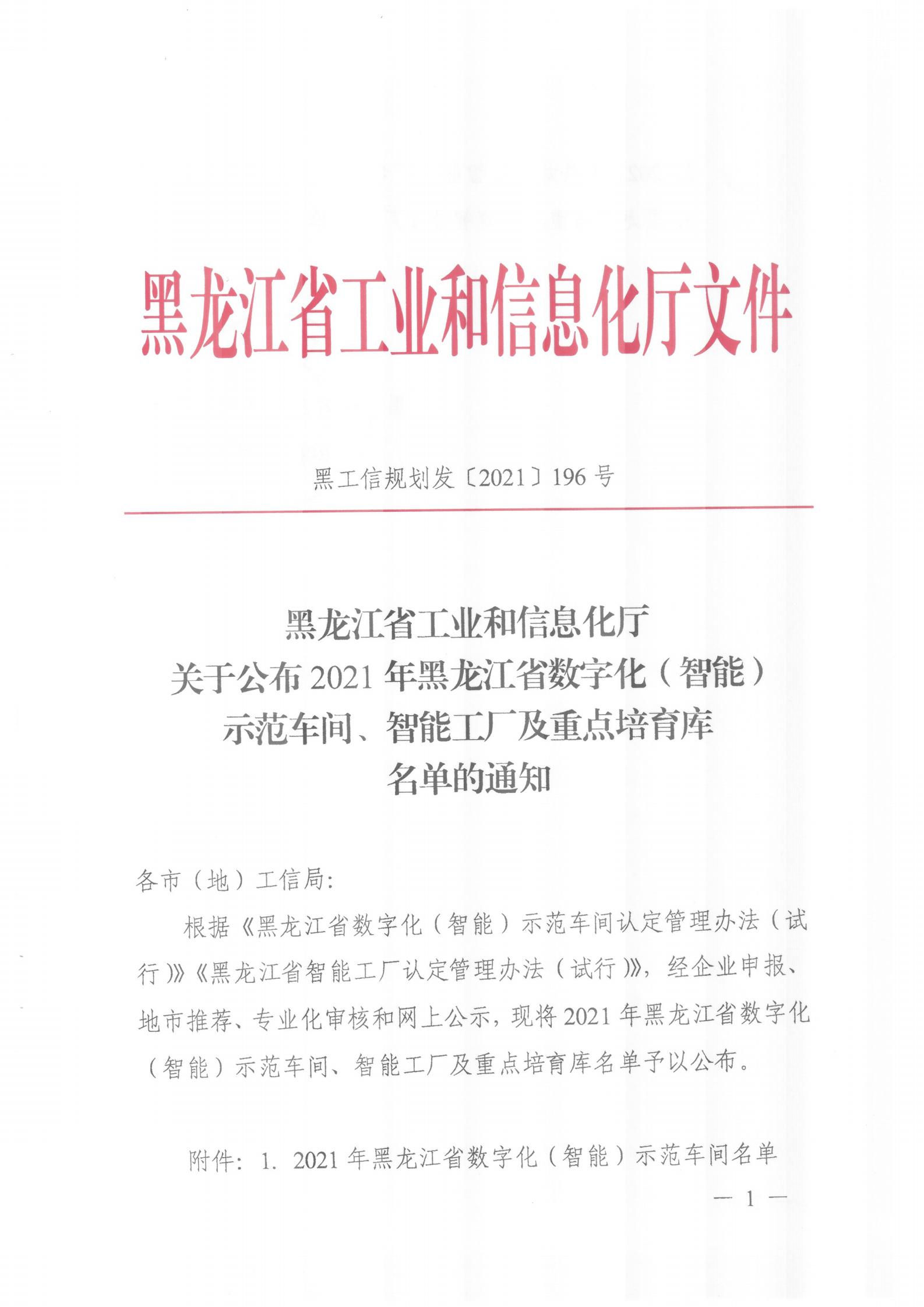 被认定为黑龙江省数字化(智能)示范车间